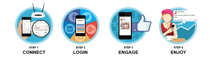 Create stunning and creative captive portal pages in a matter of minutes. Choose from a variety of social sign in options such as Facebook, Twitter, LinkedIn, and more.